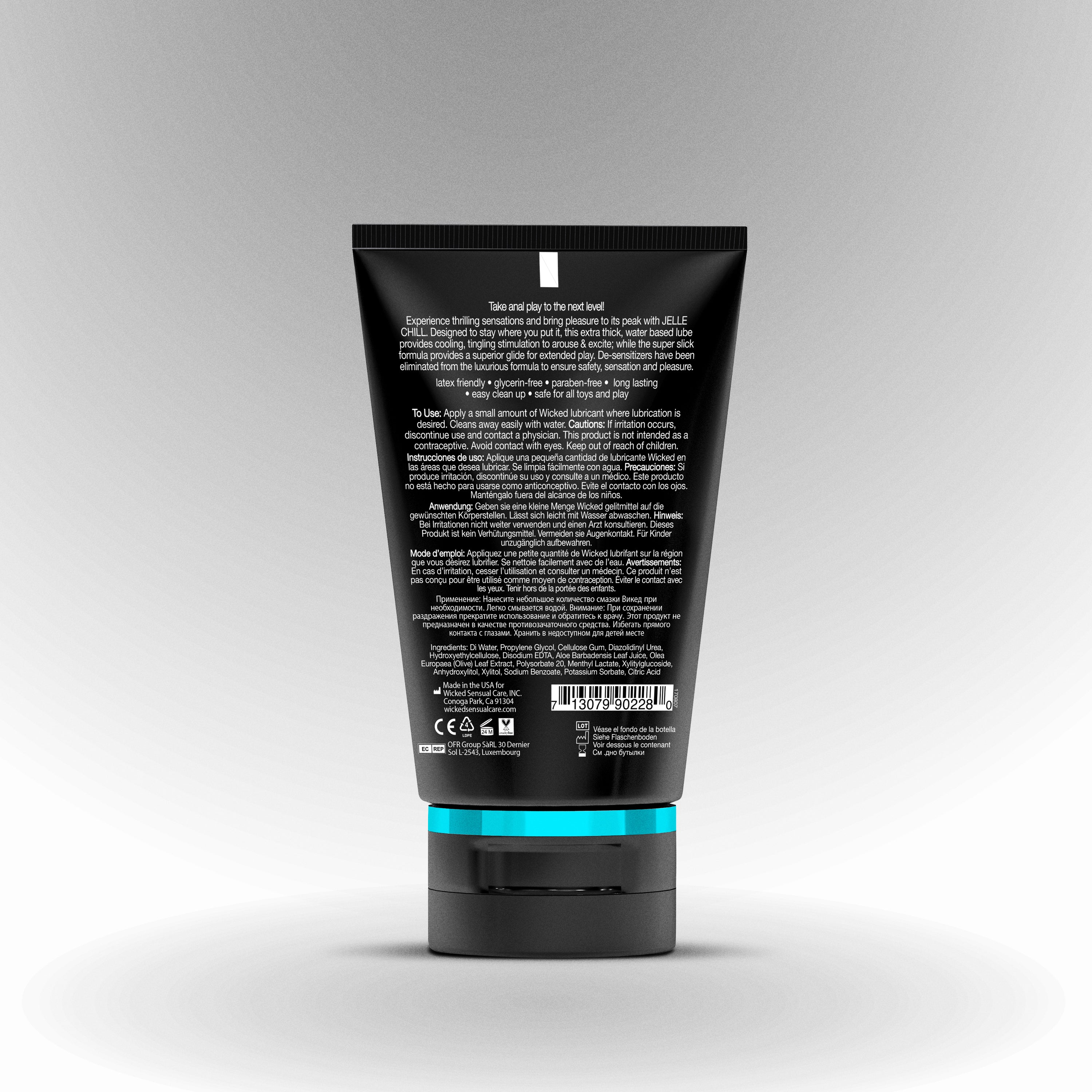 Take anal play to the next level! Experience intense sensations and bring pleasure to its peak with JELLE CHILL. Designed to stay where you put it, this extra thick, water based lube provides cooling, tingling stimulation to arouse & excite; while the super slick formula provides a superior glide for extended play. Wicked Sensual Care never uses de-sensitizers in any anal product to ensure safety, sensation and pleasure.